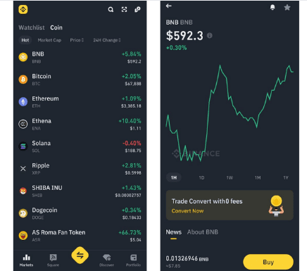 Binance Lite è una versione migliorata di Binance Pro con un'interfaccia semplificata per una navigazione facile. Si concentra su criptovalute popolari e offre opzioni di ordinamento basate su popolarità, capitalizzazione di mercato, prezzo e variazioni nelle ultime 24 ore. Gli utenti possono anche visualizzare le tendenze dei prezzi su un grafico a candela personalizzabile.