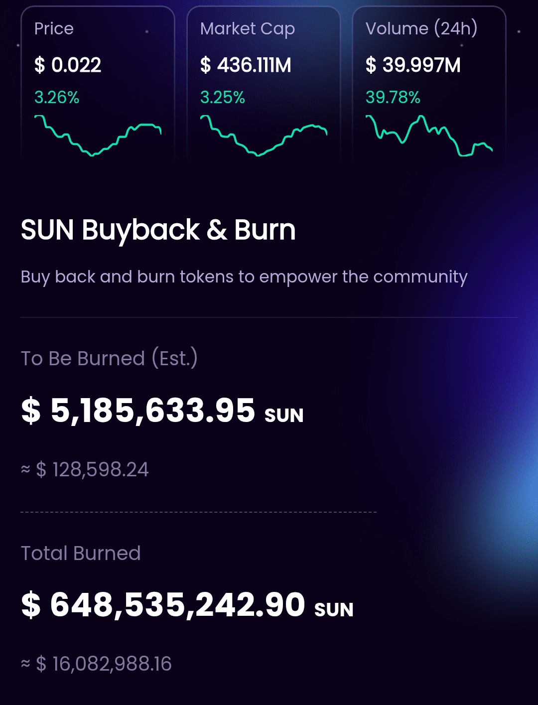 Dalla partenza del programma Buyback e Burn il 15 dicembre 2021, un totale di 648.535.242,90 token SUN sono stati rimossi permanentemente dalla circolazione.