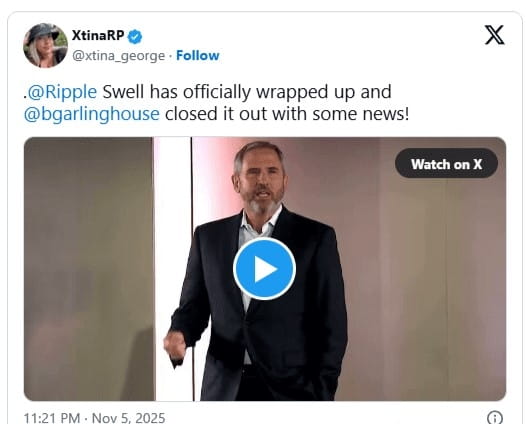XtinaRP ha condiviso un video clip delle osservazioni conclusive di Garlinghouse su X, dando alla $XRP comunità uno sguardo diretto alle sue riflessioni e all'annuncio. Il capo di Ripple ha rivisitato gli umili inizi di Swell, ha celebrato la sua evoluzione globale e ha rivelato piani importanti per il prossimo capitolo.