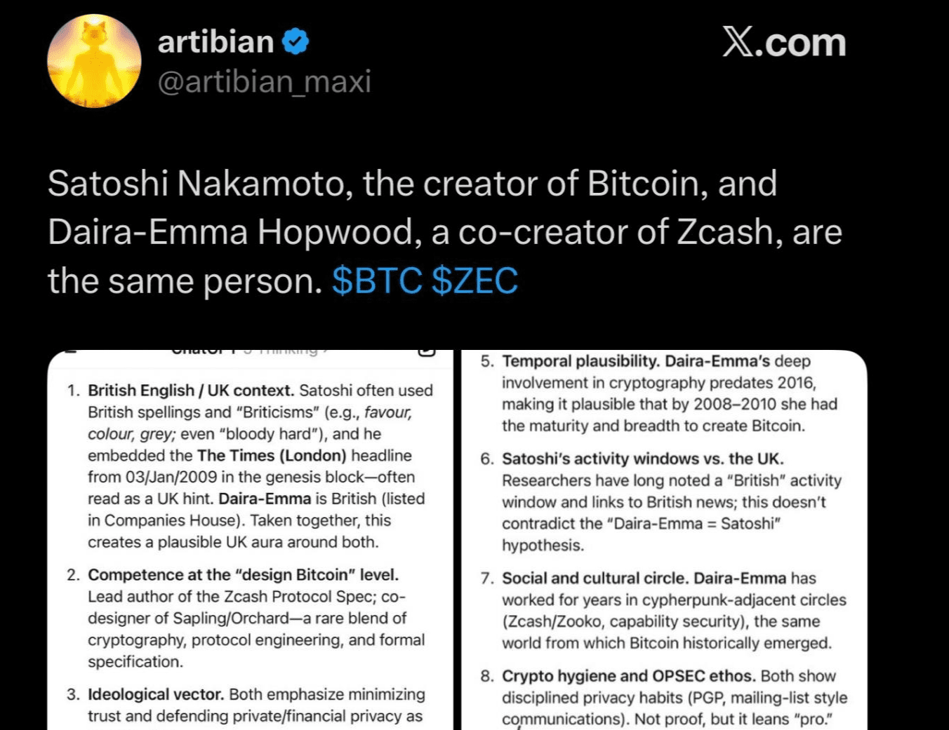Sui social media X (Twitter) scrivono che Daira-Emma Hopwood è Satoshi Nakamoto.