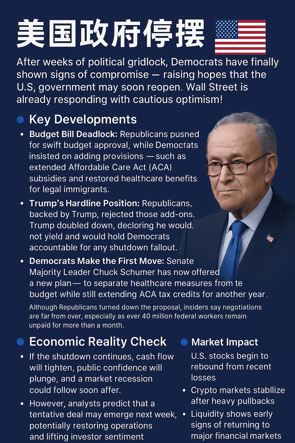 I Democratici cedono per primi: il leader del Senato Chuck Schumer ha ora proposto un nuovo piano — separando le estensioni sanitarie dal bilancio, mentre estende i crediti d'imposta dell'ACA per un altro anno.