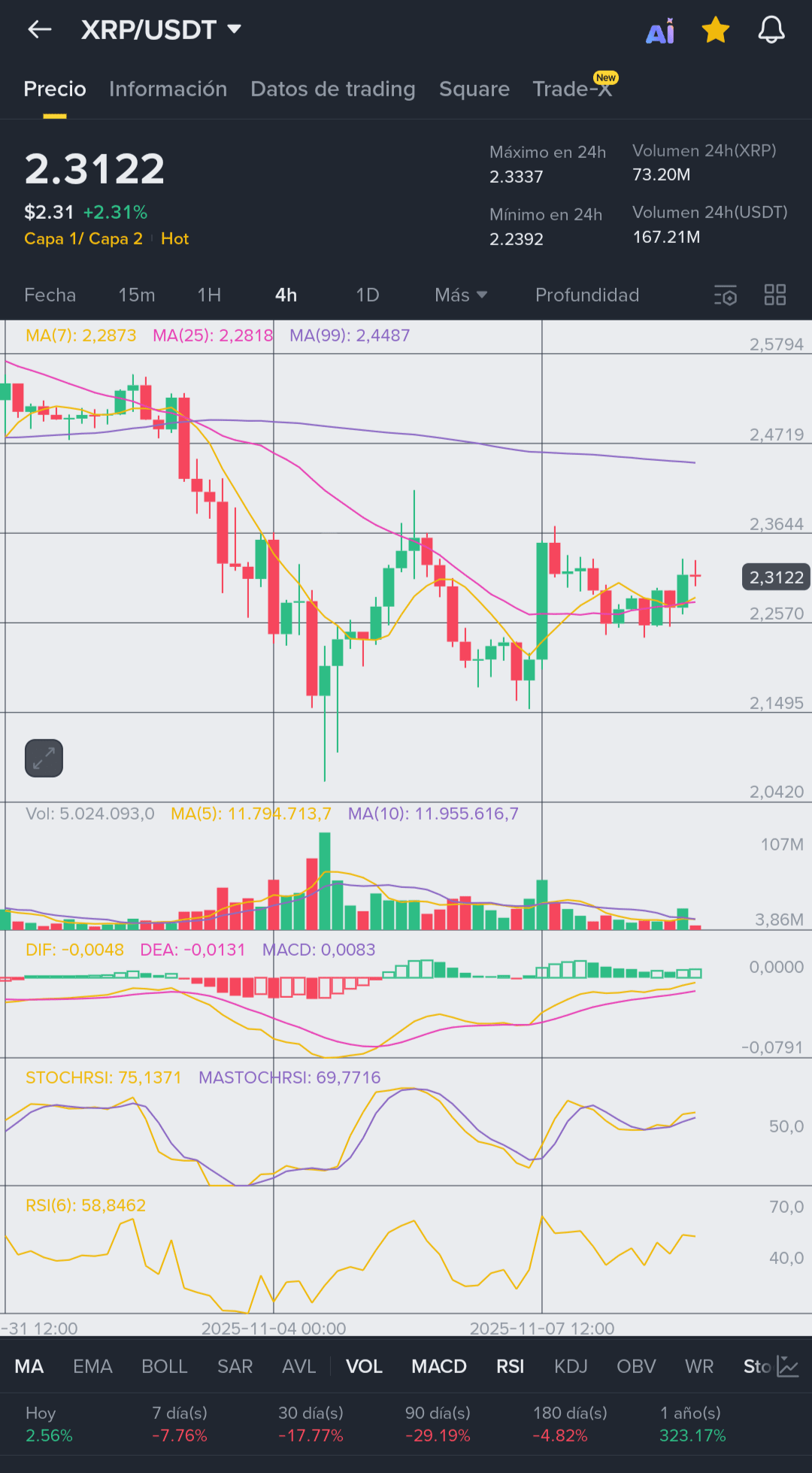 Nonostante la correzione generale del mercato cripto negli ultimi mesi, XRP mostra un chiaro accumulo tra i livelli di $2.20 e $2.35, segno di fiducia rinnovata. Gli indicatori tecnici — MACD positivo (0.0083) e RSI attorno a 58 — rivelano che l'attivo potrebbe stare iniziando una nuova fase rialzista.