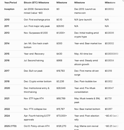 Ecco una cronologia affiancata delle principali pietre miliari dei prezzi dall'inizio ad oggi, evidenziando le fasi di crescita, i picchi e le correzioni. I primi prezzi di BTC erano vicini a $0; DOGE è partito da ~$0.0002.