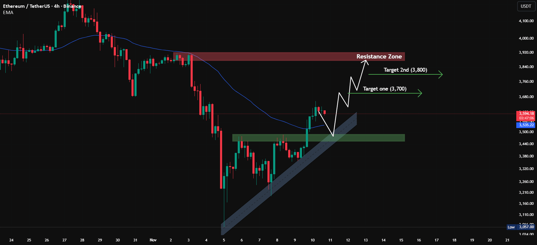 Una rottura sotto la trendline o la zona di $3,500 indebolirebbe la struttura rialzista e ritarderebbe il movimento.