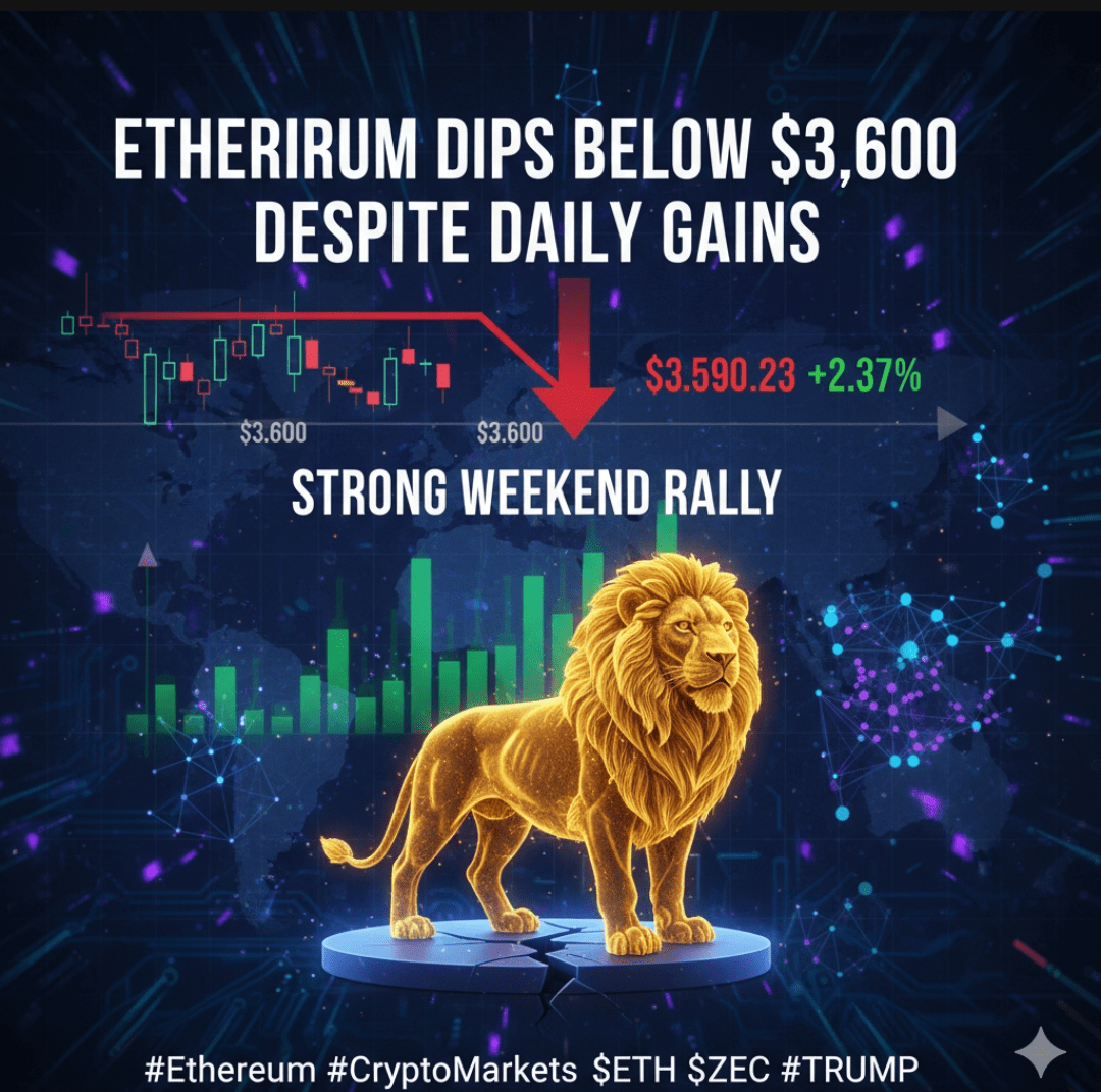 Ethereum ($ETH) รจ sceso di nuovo sotto la soglia dei $3,600, attualmente scambiato intorno ai $3,590, ๐ anche se mostra ancora un guadagno del +2.37% nella giornata.