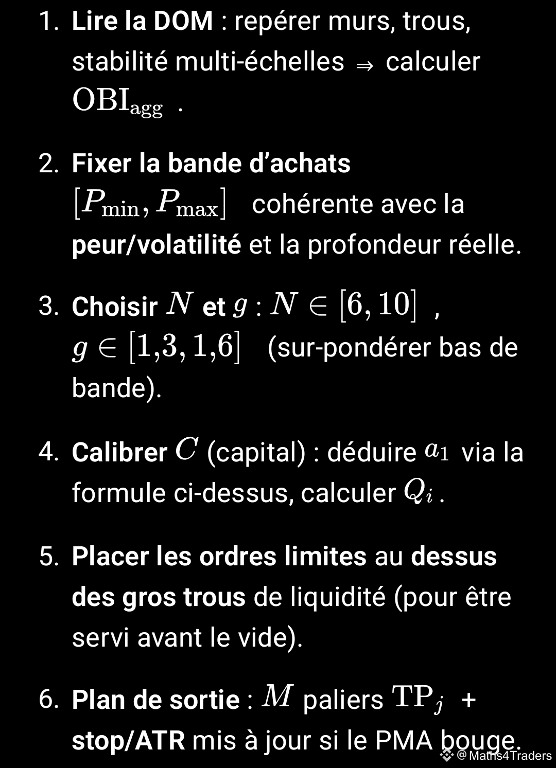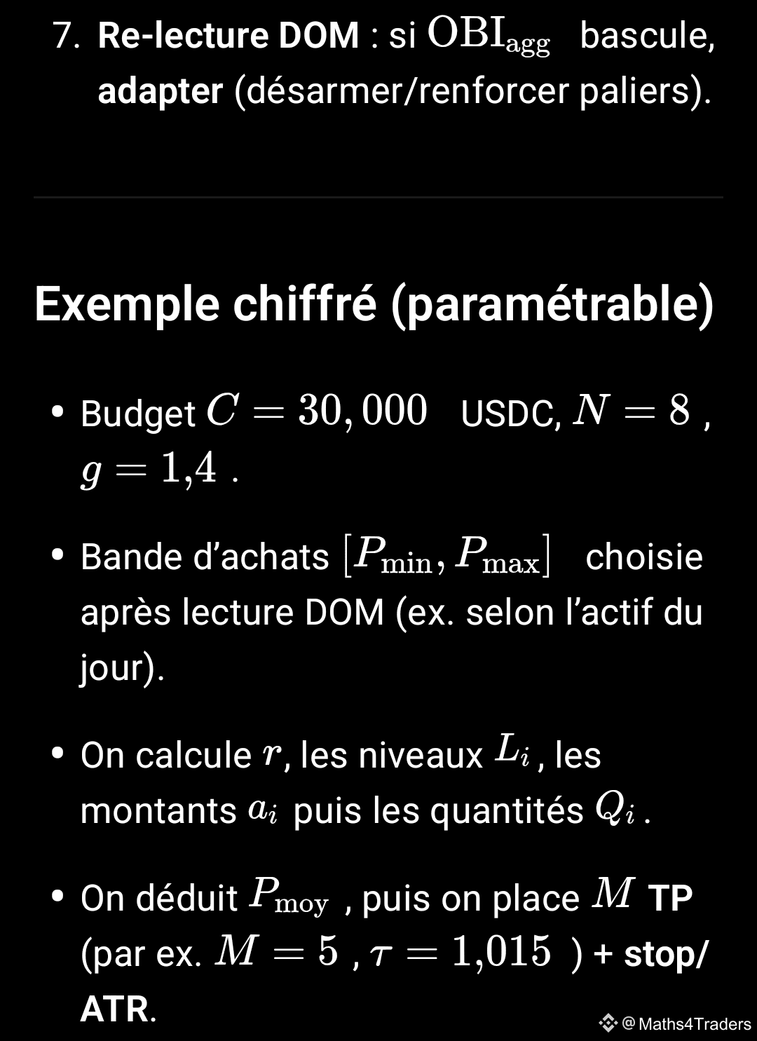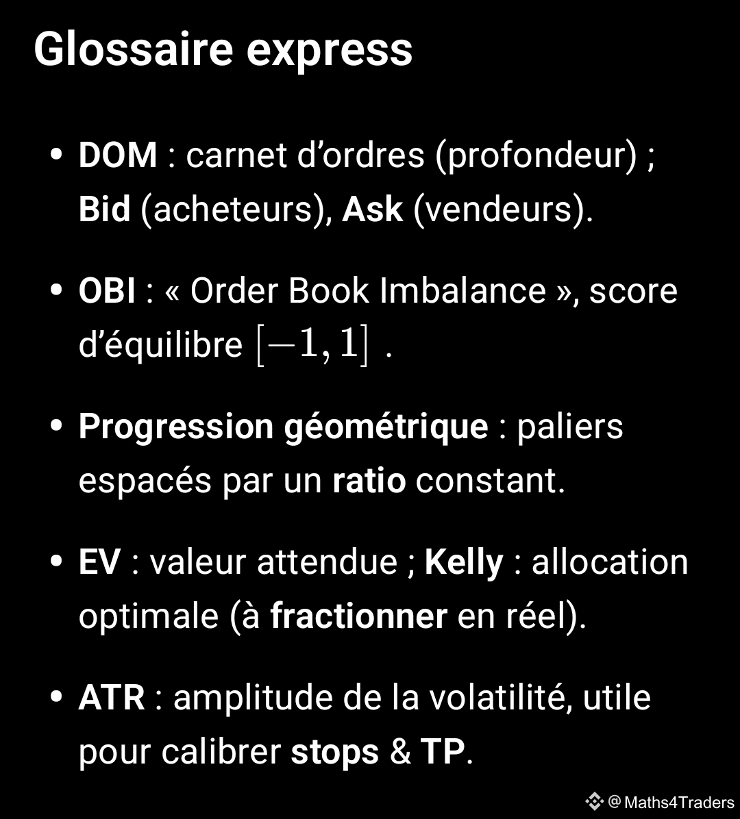 Pont avec nos « Maths résilientes » : nous suivons la dérivée résiliente à échelle L (pente robuste sur fenêtres L avec atténuation du bruit). Une DOM soutenue qui ne casse pas le plancher résilient renforce l’hypothèse de fond haussier ; l’inverse appelle à réduire l’exposition.