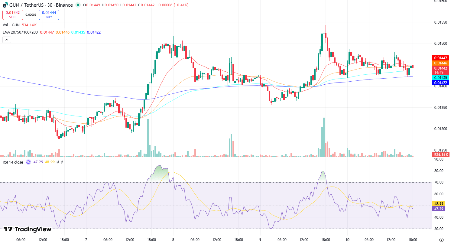 $GUN (GUN) sta attualmente scambiando a circa $0.01444 su Binance, mostrando un recente aumento di prezzo del 5.76% nelle ultime 24 ore. Tuttavia, la tendenza generale indica una significativa discesa dalla sua lanciata, con una notevole diminuzione del 42.64% negli ultimi 60 giorni e del 50.61% dall'inizio dell'anno. Gli indicatori tecnici suggeriscono un periodo di consolidamento e un potenziale movimento laterale, con l'RSI che si aggira intorno alla zona neutrale. I tag del progetto indicano che si tratta di un token di gioco con coinvolgimento nell'ecosistema di Binance. Sebbene l'azione di prezzo recente mostri un leggero aumento, la tendenza a lungo termine e il sentiment di mercato rimangono cauti.