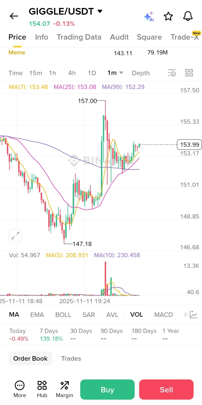 Le medie mobili (MA7 ≈ 153.48, MA25 ≈ 153.08, MA99 ≈ 152.29) sono ora allineate strettamente e inclinano verso l'alto, segnalando una tendenza rialzista a breve termine.$GIGGLE/USDT — Analisi di Mercato Dopo il Picco di 157$GIGGLE