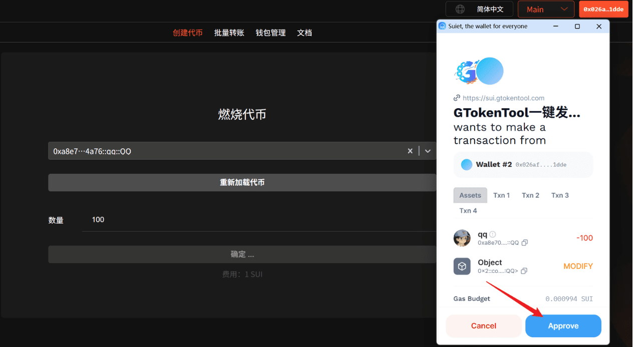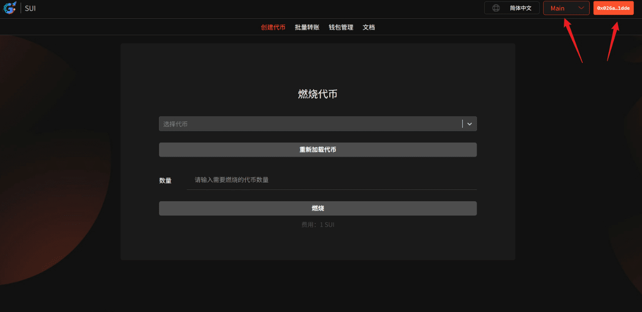 Accedi alla pagina di bruciatura token su GTokenTool, seleziona la rete Main nell'angolo in alto a destra e collega il portafoglio. Ti consigliamo di utilizzare il portafoglio Suiet.