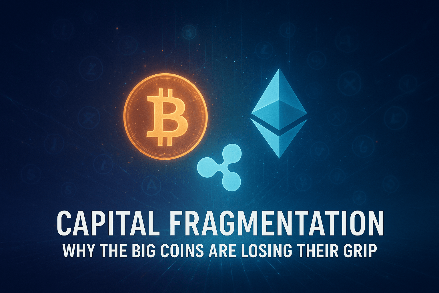 Un'illustrazione digitale futuristica che mostra i loghi di Bitcoin, Ethereum e XRP circondati da icone di altcoin più piccole e sfocate, simboleggiando un capitale disperso troppo sottile — con un titolo sovrapposto: