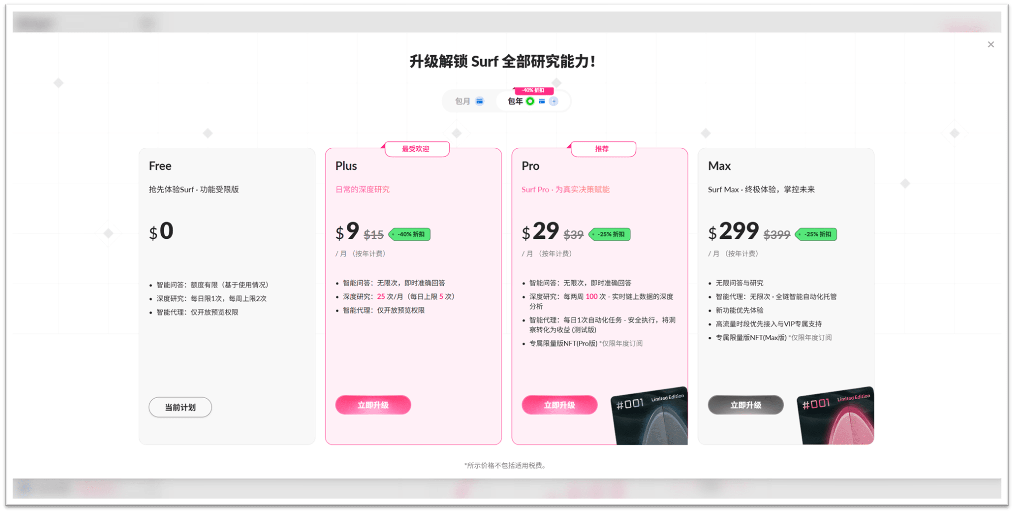 5️⃣Costo efficiente: la versione Free è gratuita, l'abbonamento Plus/Pro offre un buon rapporto qualità-prezzo (sconto del 40% se pagato annualmente), senza rischio di token (Surf non ha attualmente un piano Token).
