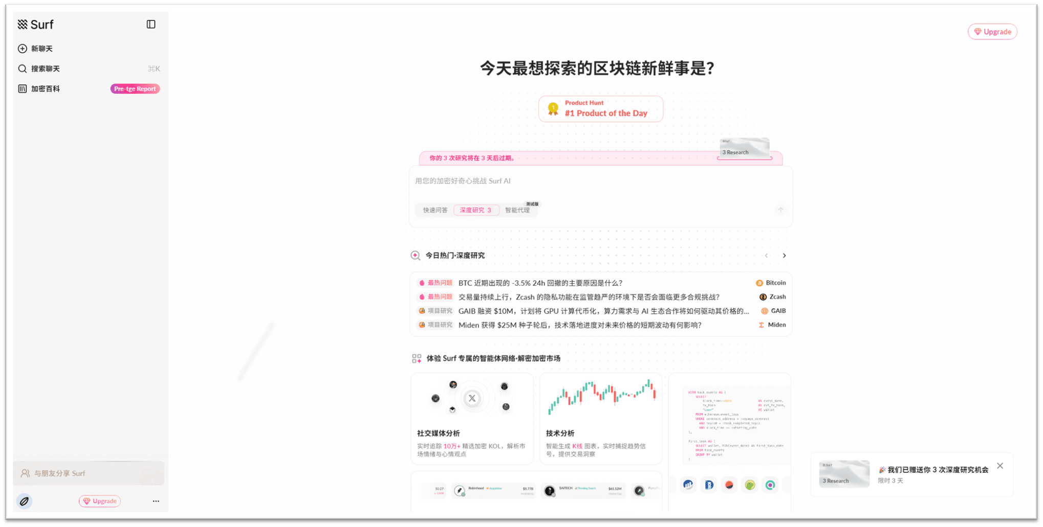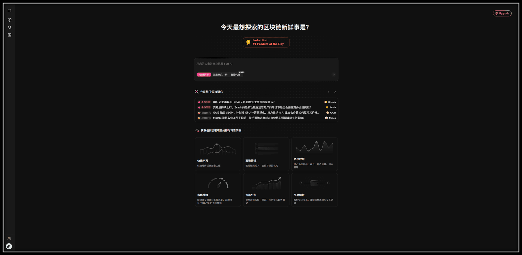 Surf è un agente AI nativo per le criptovalute addestrato da Cyber, progettato specificamente per il settore. Integra dati on-chain, analisi tecnica, sentimenti sociali e ricerche approfondite, fornendo informazioni di mercato in tempo reale e azionabili. Diversamente dai modelli generali, il core di Surf è il modello Research: una query genera report strutturati da più fonti.