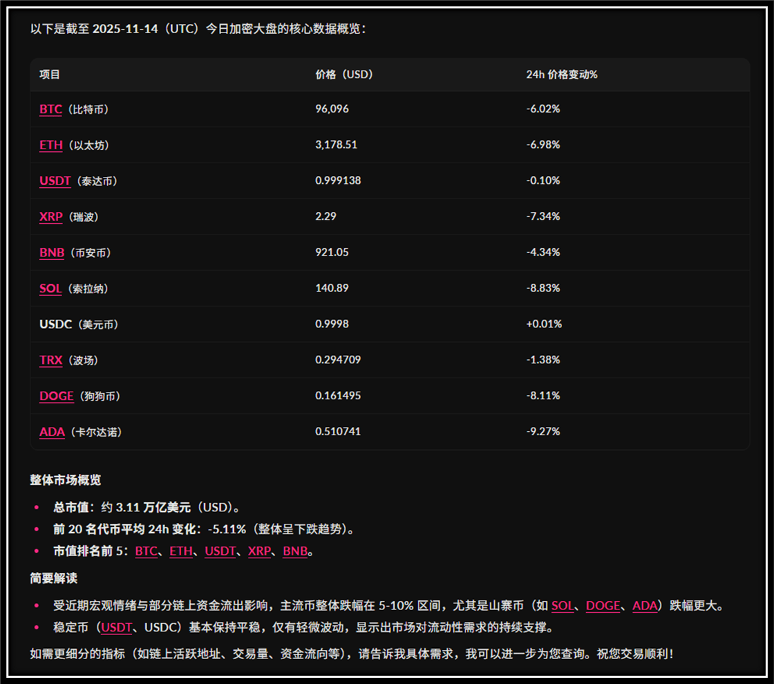 Secondo i dati di mercato del 2025-11-15, la capitalizzazione totale del mercato ha raggiunto $3.31T, con una flessione media del 24h del -6.58%; in questo contesto, l'AI deve fornire analisi immediate e complete per aiutarti a evitare trappole e cogliere opportunità. Surf è nato proprio per questo.