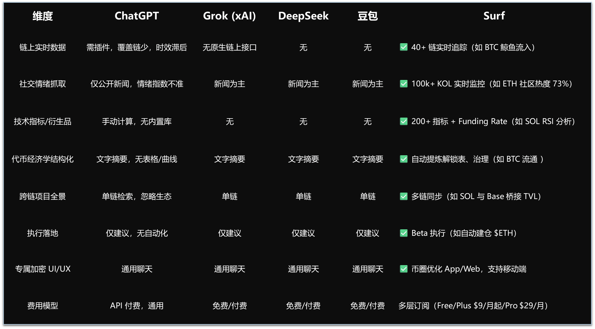 Attualmente, sebbene gli strumenti AI possano già risolvere molti problemi, i modelli AI tradizionali come ChatGPT, Grok, DeepSeek e 豆包, pur eccellendo nella generazione di linguaggio generale, faticano a soddisfare le esigenze specifiche del settore delle criptovalute. Dipendono da conoscenze statiche o da ricerche generalizzate, non possono accedere in tempo reale ai dati delle blockchain pubbliche, l'analisi è in ritardo, l'integrazione di più fonti è insufficiente e possono solo fare affidamento sugli input degli utenti da collegamenti esterni, producendo output vaghi e privi di interpretazioni strutturate sui token e panorami ecologici cross-chain.