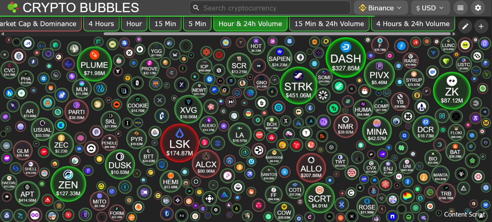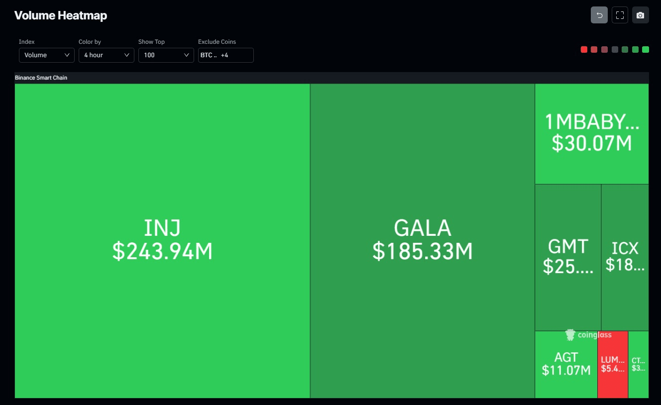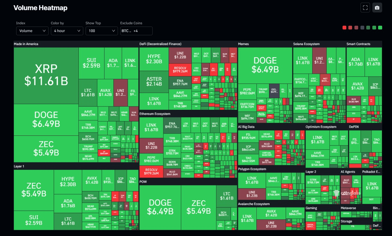 La mappa di calore del volume di 4 ore mostra quali coin stanno attirando la maggior parte dell'attività di trading nel breve periodo.