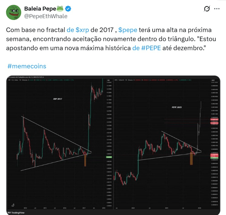Nel frattempo, l'analista conosciuto come @PepeEthWhale rafforza il confronto tra il PEPE e il comportamento dell'XRP nel 2017, evidenziando che la struttura del token sembra ripetere un frattale antico. Egli afferma che il prezzo potrebbe “avere un aumento nella prossima settimana” se il token recupera spazio all'interno di un grande triangolo tecnico. Il trader proietta anche, in modo molto personale, una possibilità che il PEPE possa cercare un nuovo massimo storico entro dicembre