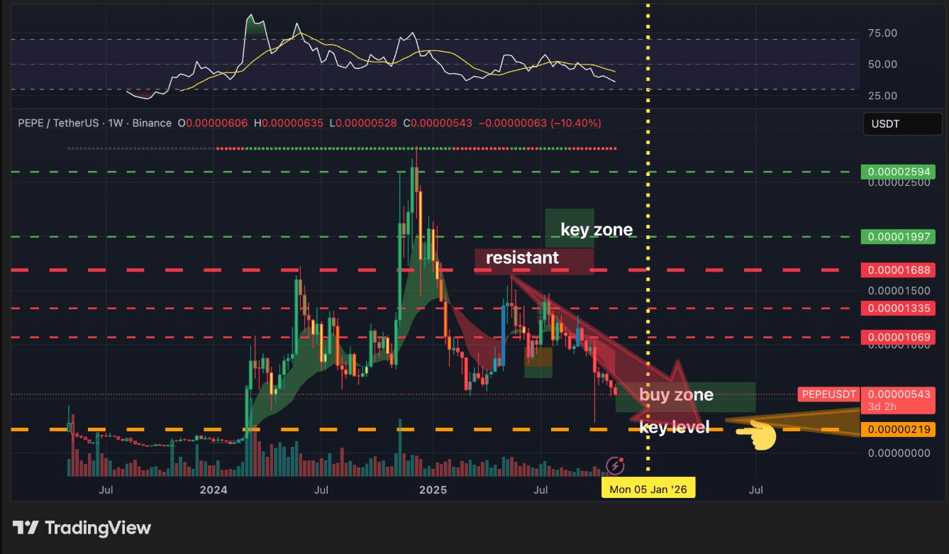 Un altro esperto, @Lamatrade1, ha condiviso una lettura che rafforza il dibattito tecnico. Egli sottolinea che il PEPE si avvicina a una zona di supporto a lungo termine, descritta come un possibile “rimbalzo della rana verde morta.” Nel grafico settimanale, c'è una banda di resistenza discendente, un'area di acquisto e un supporto inferiore allineato con livelli storici importanti