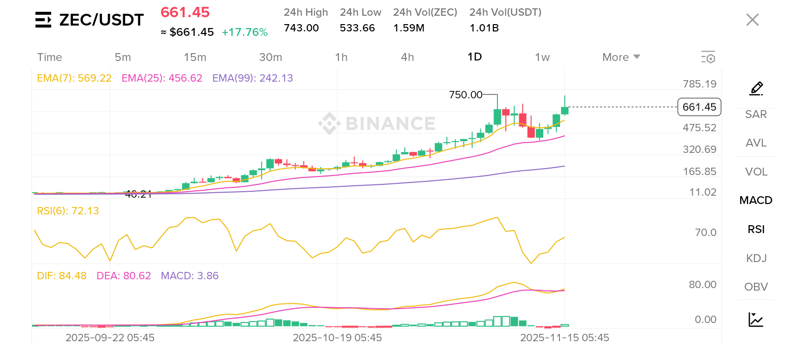 📈 Analisi del Grafico (1-Giorno ZEC/USDT)