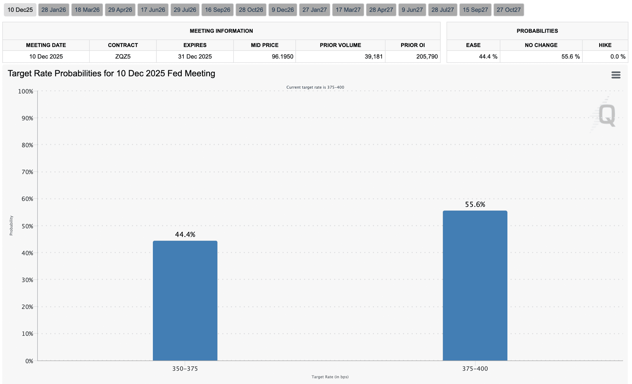 Il tema centrale della scorsa settimana è stato il significativo ribasso delle aspettative di taglio dei tassi che ha provocato una correzione del mercato. Sabato scorso, la Fed di Kansas City e la Fed di Dallas hanno entrambi rilasciato segnali cauti sul taglio dei tassi di dicembre durante la conferenza annuale sull'energia, con il mercato che è passato da una visione ottimista sul taglio dei tassi di fine anno a una valutazione più cauta. Il CME Group FedWatch mostra che la probabilità di un terzo taglio dei tassi quest'anno il 10 dicembre è precipitata a circa 44%, in calo di circa 20 punti percentuali rispetto alla settimana precedente, e ora il mercato è più orientato verso un percorso di 'due tagli dei tassi quest'anno, per un totale di 50 punti base'.