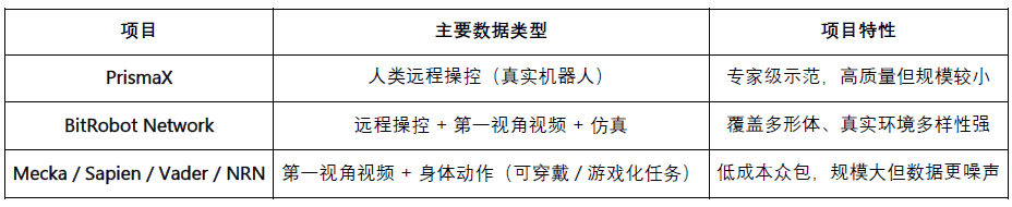 Progresso del progetto e valutazione della realtà: PrismaX ha lanciato una versione beta nel agosto 2025 (gateway.prismax.ai), gli utenti possono controllare a distanza i bracci robotici per eseguire esperimenti di presa e generare dati di addestramento. Il motore di valutazione è attualmente in esecuzione interna, complessivamente, il livello di realizzazione tecnica di PrismaX è relativamente alto, con una chiara posizione, ed è il livello intermedio chiave che collega "operazioni umane × modelli AI × liquidazione blockchain". Il suo potenziale a lungo termine potrebbe diventare "il protocollo di lavoro e dati decentralizzato dell'era dell'intelligenza incarnata", ma a breve termine affronta ancora sfide di scalabilità.