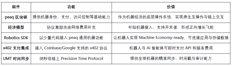 peaq è una blockchain Layer-1 progettata per l'economia delle macchine, fornendo identità di macchina, portafogli on-chain, controlli di accesso e sincronizzazione temporale a livello di nanosecondi (Universal Machine Time) per milioni di robot e dispositivi. Il suo Robotics SDK consente agli sviluppatori di rendere i robot "pronti per l'economia delle macchine" con pochissimo codice, garantendo interoperabilità e interazione tra diversi produttori e sistemi.