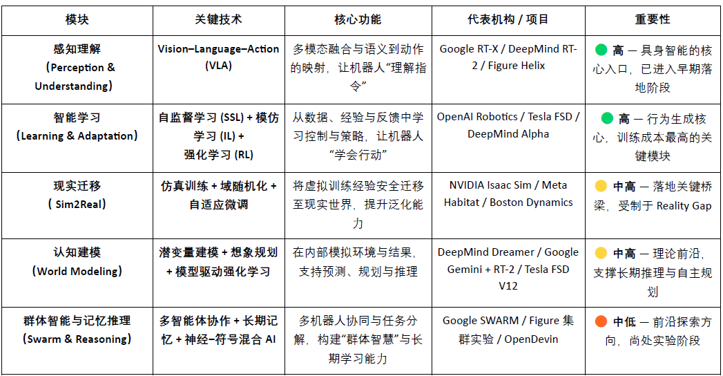 Il sistema tecnologico centrale dell'intelligenza incarnata può essere visto come uno stack intelligente dal basso verso l'alto: VLA (fusione percettiva), RL/IL/SSL (apprendimento intelligente), Sim2Real (migrazione reale), World Model (modellazione cognitiva), e collaborazione tra più agenti e ragionamento di memoria (Swarm & Reasoning). Tra questi, VLA e RL/IL/SSL sono il "motore" dell'intelligenza incarnata, determinando la sua implementazione e commercializzazione; Sim2Real e World Model sono tecnologie chiave che collegano l'addestramento virtuale all'esecuzione reale; la collaborazione tra più agenti e il ragionamento di memoria rappresentano un'evoluzione cognitiva e collettiva a un livello superiore.