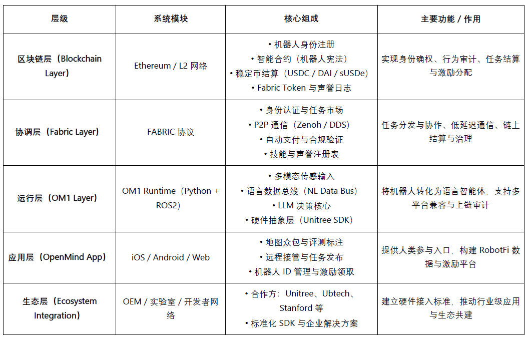 Il nucleo di OpenMind è quello di fungere da livello intermedio intelligente tra LLM (grandi modelli di linguaggio) e il mondo dei robot, trasformando realmente l'intelligenza linguistica in intelligenza incarnata (Embodied Intelligence), costruendo uno scheletro intelligente che va dalla comprensione (Language → Action) all'allineamento (Blockchain → Rules). Il sistema multilivello di OpenMind realizza un ciclo completo di collaborazione: gli umani forniscono feedback e annotazioni attraverso l'app OpenMind (dati RLHF), la rete Fabric si occupa della verifica dell'identità, della distribuzione dei compiti e del coordinamento della liquidazione, i robot OM1 eseguono i compiti e seguono la "costituzione robotica" sulla blockchain per completare l'audit delle azioni e il pagamento, realizzando così una rete di collaborazione robotica decentralizzata di feedback umano → collaborazione sui compiti → liquidazione on-chain.