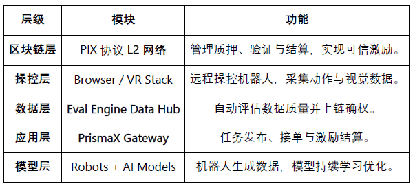 PrismaX è una rete decentralizzata di controllo remoto e economia dei dati per l'intelligenza incarnata (Embodied AI), progettata per costruire un "mercato globale del lavoro robotico", consentendo agli operatori umani, ai dispositivi robotici e ai modelli AI di co-evolvere tramite un sistema di incentivi on-chain. Il nucleo del progetto comprende due componenti principali: