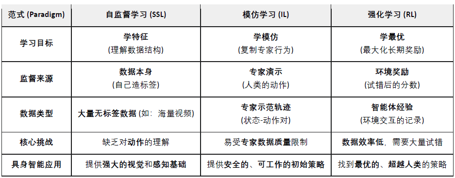 Nell'intelligenza incarnata (Embodied AI), l'apprendimento autosupervisionato (SSL) mira a far prevedere ai robot i cambiamenti di stato e le leggi fisiche dai dati di percezione, comprendendo così la struttura causale del mondo; l'apprendimento per rinforzo (RL) è il motore centrale della formazione dell'intelligenza, ottimizzando le strategie di azione dei robot attraverso l'interazione con l'ambiente e il segnale di premio; l'apprendimento per imitazione (IL) accelera questo processo attraverso dimostrazioni umane, consentendo ai robot di acquisire rapidamente priorità di azione. Le direzioni principali attuali mirano a combinare i tre approcci, costruendo un quadro di apprendimento gerarchico: SSL fornisce una base di rappresentazione, IL conferisce priorità umane, RL guida l'ottimizzazione delle strategie, bilanciando efficienza e stabilità, formando insieme il meccanismo centrale dell'intelligenza incarnata dalla comprensione all'azione.