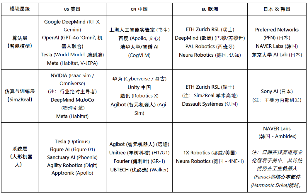 La Cina ha formato un vantaggio competitivo nei componenti, nelle fabbriche automatizzate e nei robot umanoidi grazie alla produzione su larga scala, all'integrazione verticale e alla spinta politica, con capacità eccezionali in hardware e catena di approvvigionamento, aziende come Yushu e UBTECH hanno già raggiunto la produzione su larga scala, estendendosi verso il livello di decisione intelligente. Tuttavia, esiste ancora un notevole divario rispetto agli Stati Uniti nei livelli di algoritmi e simulazione.