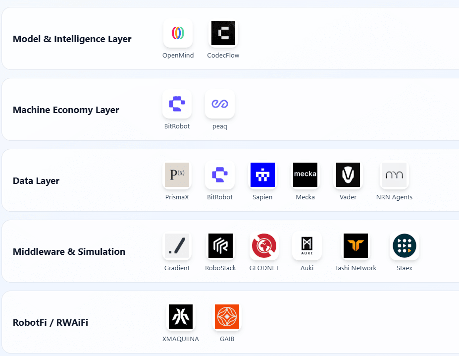 Le capacità chiave dei robot — navigazione, localizzazione, connettività e modellazione spaziale — costituiscono il ponte chiave tra il mondo fisico e la decisione intelligente. Sebbene progetti DePIN più ampi (Silencio, WeatherXM, DIMO) inizino a menzionare "robot", i seguenti progetti sono direttamente correlati all'intelligenza incarnata.