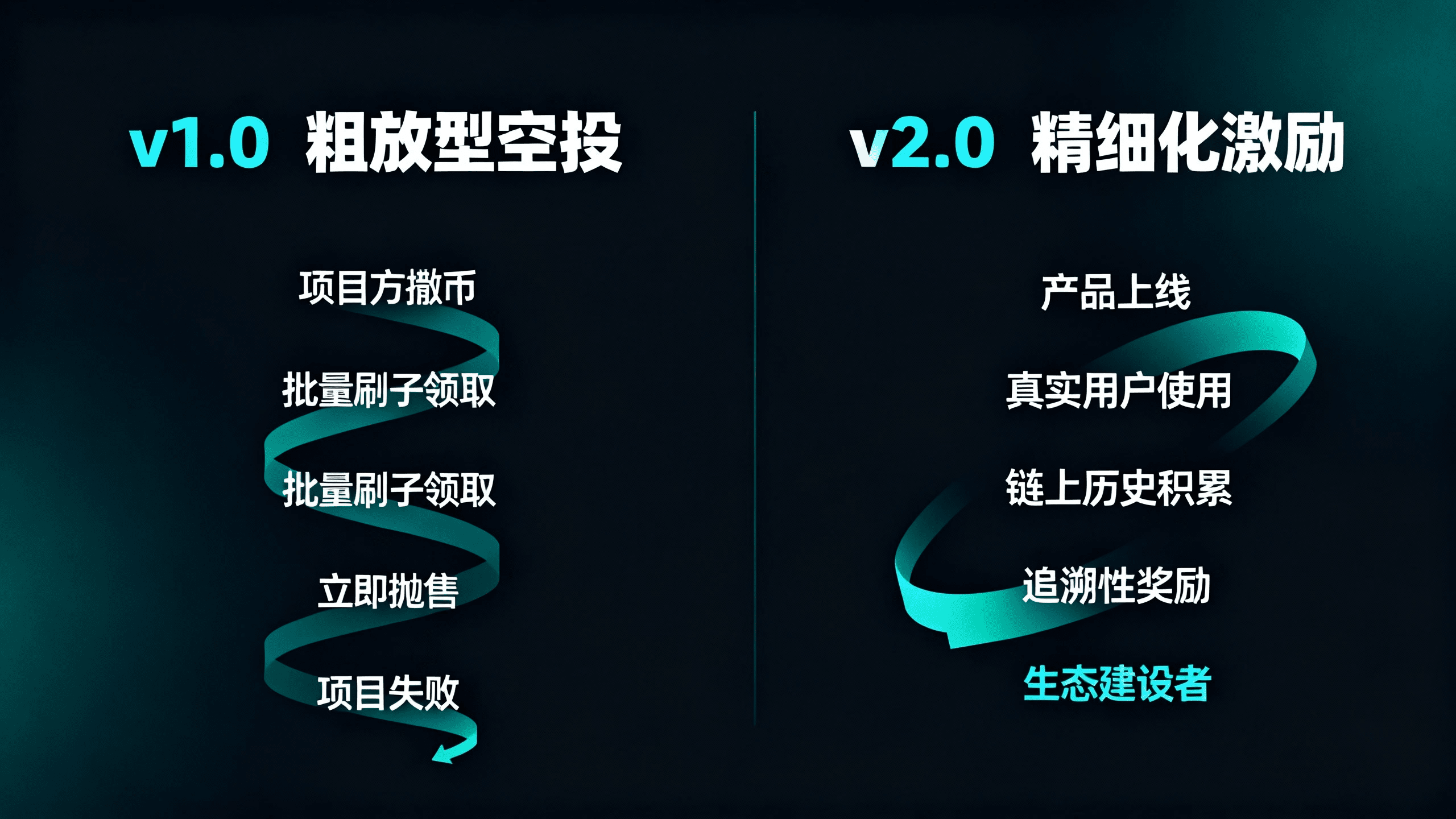La logica centrale qui è passare da "mining dell'attenzione" a "premi per la creazione di valore"; dal punto di vista di un programmatore, l'airdrop v1.0 è come assegnare risorse CPU a ogni visitatore, alla fine il 99% delle risorse è consumato da bot come Tencent Holdings, Alibaba Holdings, ecc. La logica v2.0 è: assegnare risorse solo agli utenti che utilizzano realmente il prodotto, e non a coloro che sono solo lì per "raschiare il fondo".