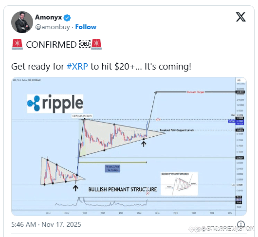 $XRP Crypto analyst Amonyx (@amonbuy) has shared a chart highlighting a long bullish pennant on XRP’s monthly timeframe. He told investors to prepare for XRP to hit $20, showing his conviction in the setup.