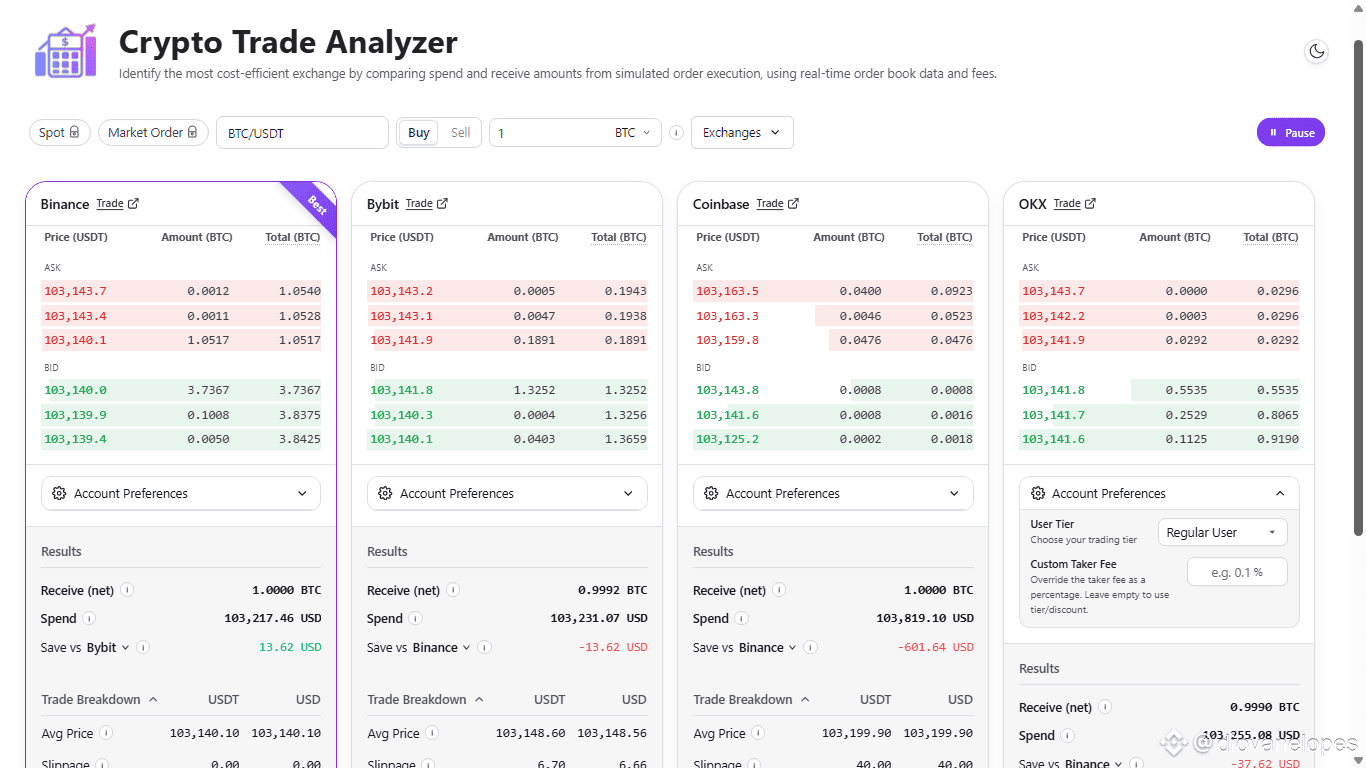 Ele simula uma ordem de compra ou venda em tempo real nas 4 maiores exchanges (Binance, OKX, Coinbase, Bybit) e mostra, com precisão, qual delas oferece a melhor "taxa efetiva" naquele exato momento.