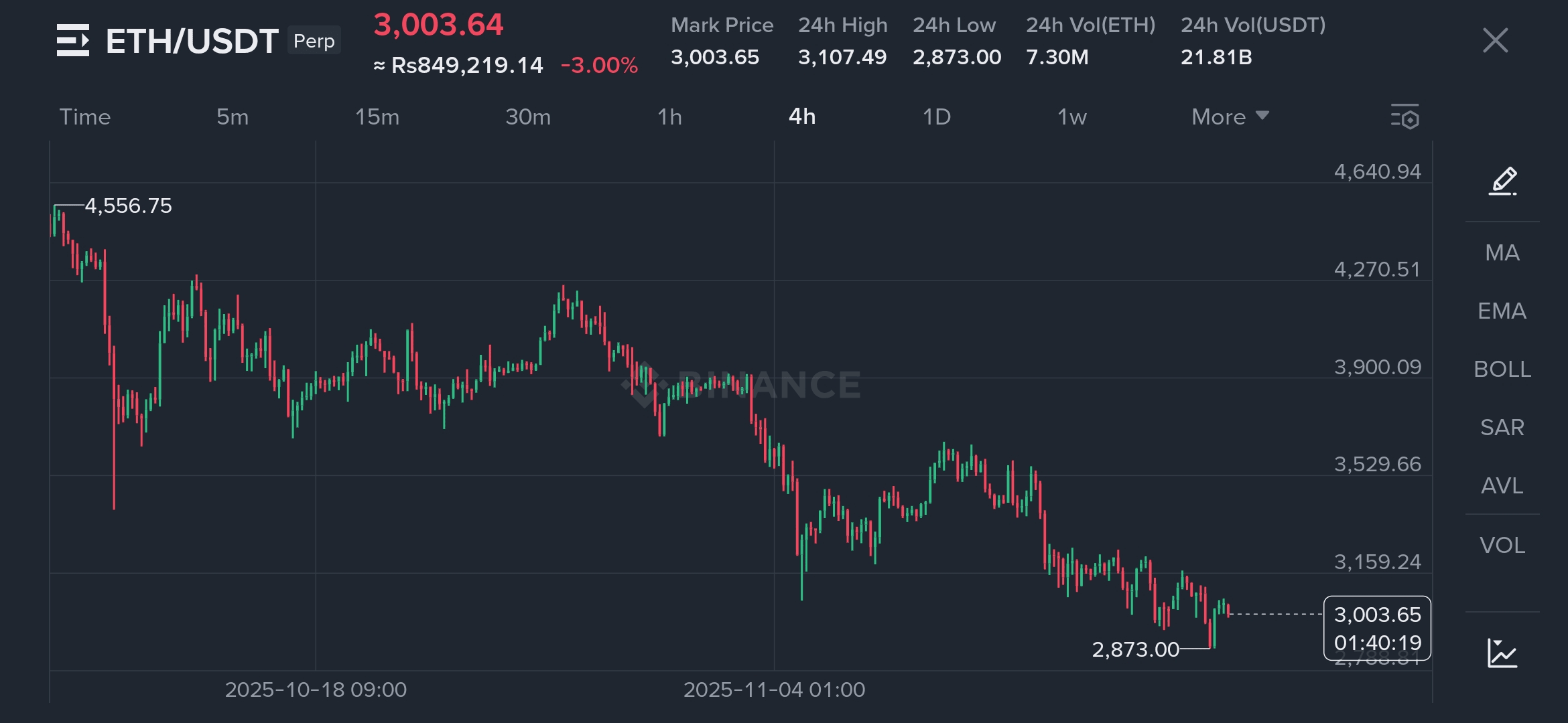 Il prezzo è sceso da un massimo di circa $4,556.75 (il 18 ottobre) al prezzo attuale di $3,003.64 (il 20 novembre), toccando un recente minimo intorno a $2,873.00. Questo dimostra una forte tendenza ribassista nel periodo osservato.