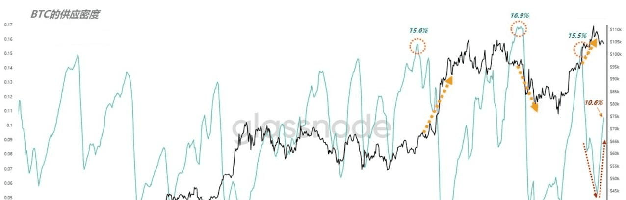 La distribuzione dei chip on-chain mostra che l'intervallo tra 93.000 e 98.000 dollari rimane un forte supporto stabile, ma più chip si stanno spostando verso l'intervallo di 100.000 a 105.000 dollari. Questi giocatori sono principalmente posizioni a breve termine, facilmente influenzabili dalle fluttuazioni dei prezzi. Recentemente, il prezzo di Bitcoin ha oscillato in modo ristretto attorno ai 105.000 dollari, ma i dati on-chain rivelano una tendenza preoccupante: la concentrazione dei chip è aumentata rapidamente dal 5,3% al 10,6% negli ultimi dieci giorni, con segnali di accelerazione. Se questa tendenza continua, ci si aspetta che la concentrazione possa superare la soglia chiave del 15% in una o due settimane, innescando un aggiustamento strutturale del mercato.