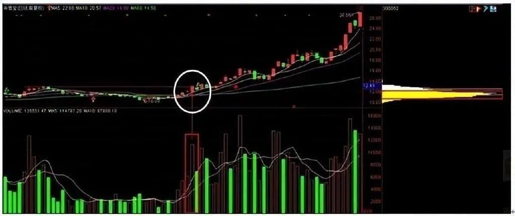 ⑥ Blocco inferiore, il mercato non è finito. Durante il processo di rialzo del prezzo delle azioni, se il picco denso a un livello basso non si è mosso, significa che il mercato mantiene una stabilità di raccolto e la pressione di vendita all'interno non è alta. Questa situazione si verifica spesso in azioni in cui sono coinvolti fondi principali, il che indica che i fondi principali non hanno distribuito il raccolto, quindi il mercato non è ancora terminato e il prezzo delle azioni continuerà a salire. Per queste azioni, gli investitori possono continuare a detenere azioni o partecipare a operazioni a breve termine.