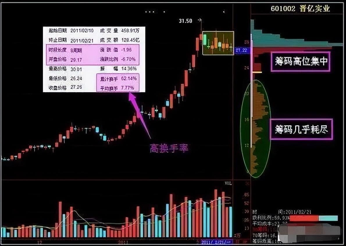 Poiché i principali attori possiedono una quantità maggiore di raccolto, è necessaria una maggiore rotazione per completare la distribuzione. Pertanto, durante il processo di rialzo in cui il prezzo delle azioni stabilisce nuovi massimi, il volume delle transazioni aumenta continuamente, e il tasso di rotazione aumenta, offrendo ai principali attori una buona opportunità per distribuire il raccolto.