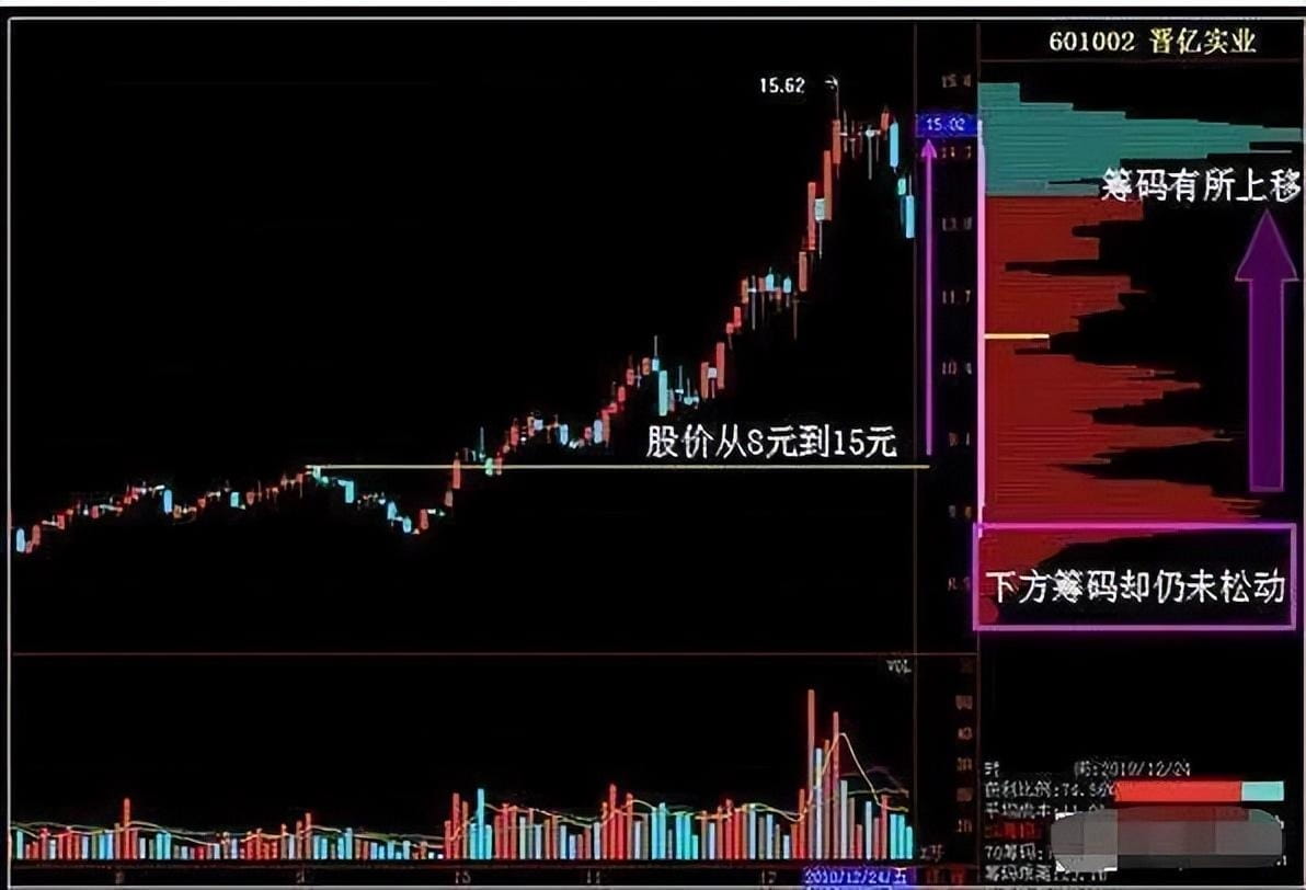 Durante il processo di rialzo, gli investitori retail continuano a inseguire il rialzo, mentre la paura di alti porta a realizzare profitti, i principali attori ne approfittano per vendere e comprare, continuando a far salire il prezzo delle azioni, creando un "piano di sollevamento" impeccabile. Nella figura sottostante, il raccolto inizia a muoversi e disperdersi continuamente dalla concentrazione a 8 yuan, ma il raccolto a basso prezzo a 8 yuan rimane abbondante. Questo significa che durante il processo di rialzo del prezzo delle azioni da 8 yuan a 15 yuan, i principali attori non hanno intenzione di liberarsi completamente delle loro posizioni.