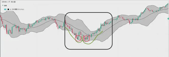 Attraverso il grafico sopra, possiamo vedere che è apparso un segnale di inversione di Bollinger nel riquadro nero, successivamente possiamo notare che ci sono segni di 'restringimento del canale di Bollinger', infine il mercato tende a salire.