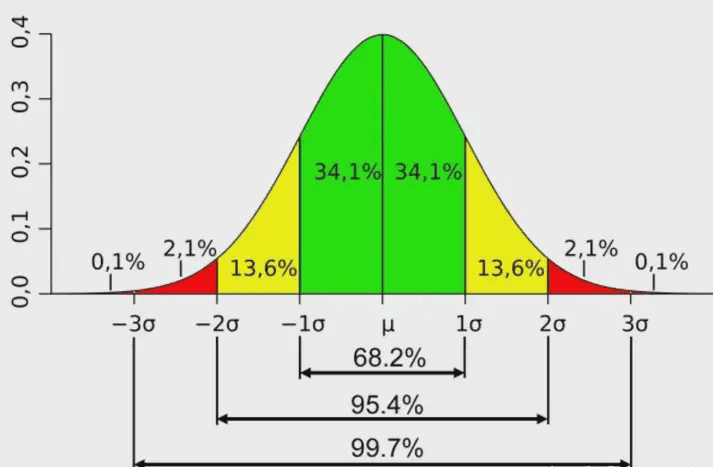 Grafico della distribuzione normale: in una distribuzione normale, circa il 68,2% dei punti dati si trova entro ±1 deviazione standard dalla media, mentre circa il 95,4% dei punti dati si trova entro ±2 deviazioni standard dalla media, e circa il 99,7% dei punti dati si trova entro ±3 deviazioni standard dalla media.