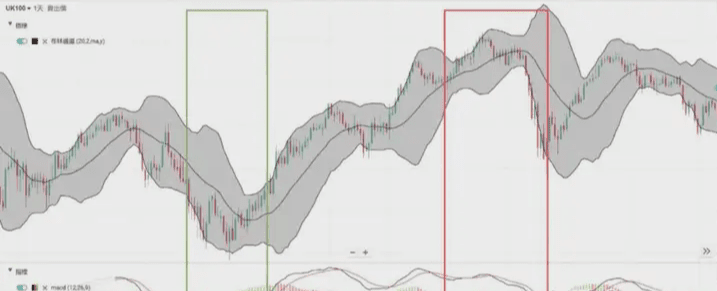 Attraverso il grafico sopra, possiamo vedere che il punto nel riquadro rosso mostra che la candela ha toccato la banda inferiore, è un fenomeno di ipervenduto, ma non significa necessariamente che ci sarà un rimbalzo, è comunque necessario osservare l'area in cui si trova. Qui, i trader devono osservare attentamente e abbinare più indicatori per giudicare la tendenza.