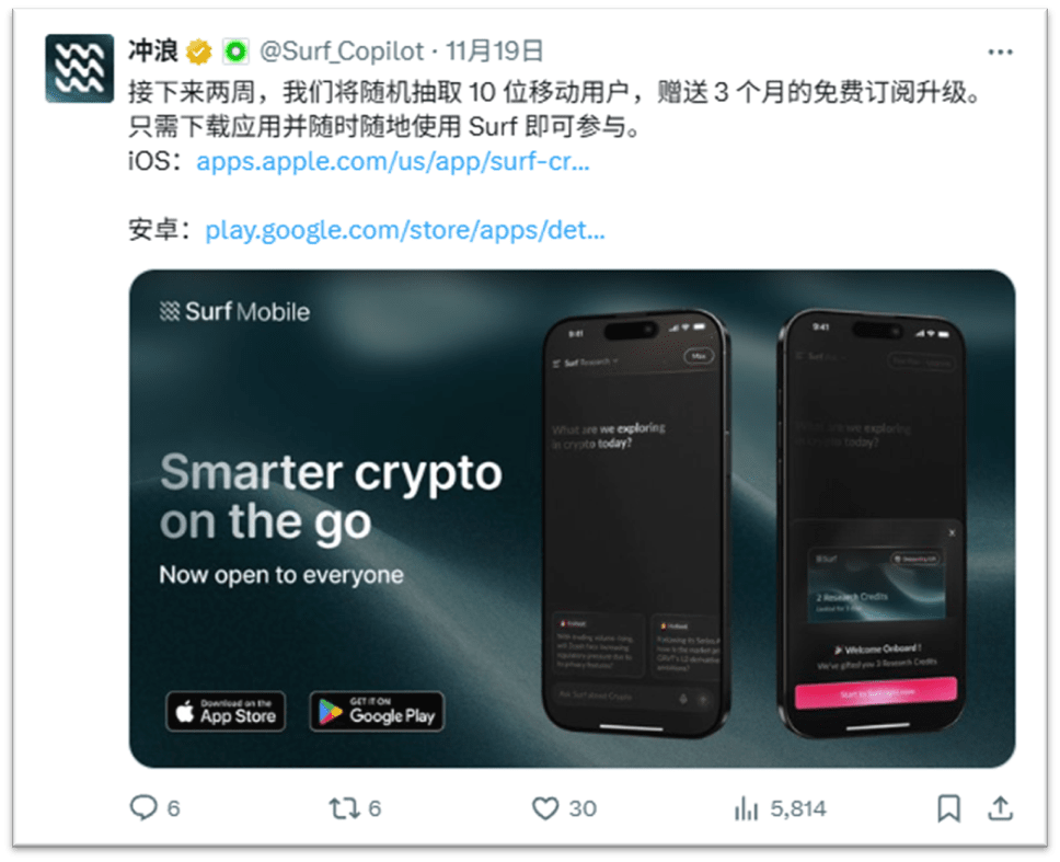 Ora, la buona notizia è arrivata: Surf AI Mobile è ufficialmente online! Che tu sia in metropolitana, in viaggio per lavoro, o che tu stia controllando il mercato a mezzanotte, puoi 'ottenere un'intuizione con un clic' sull'intero panorama dei token, conquistando un vantaggio sul mercato.
