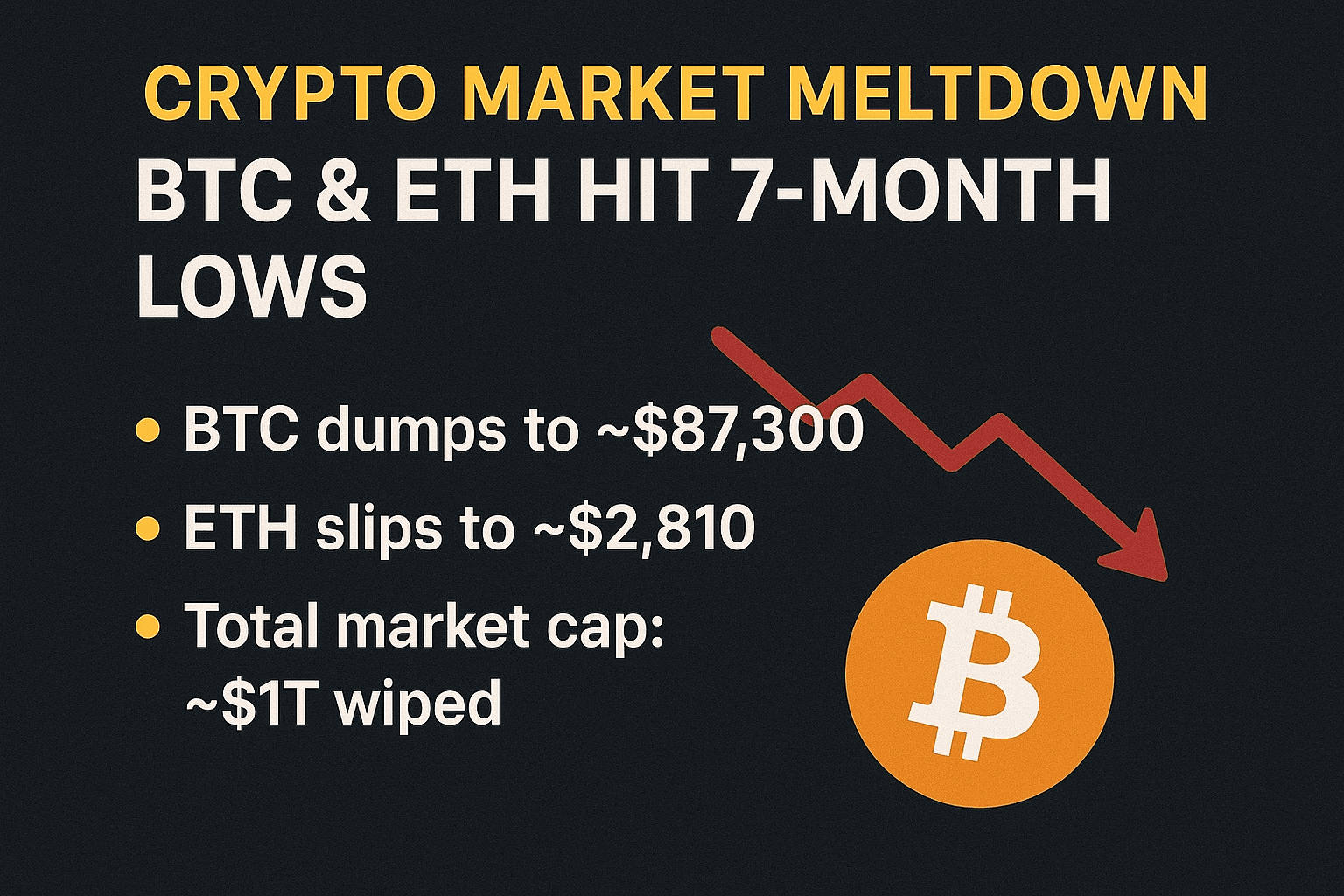 Il mercato sta sanguinando mentre Bitcoin scende a ~$87,300 e Ethereum scivola a ~$2,810, cancellando oltre $1T dalla capitalizzazione totale del mercato delle criptovalute. Il rally di ottobre è completamente invertito, e la pressione macroeconomica sta scuotendo la fiducia degli investitori.