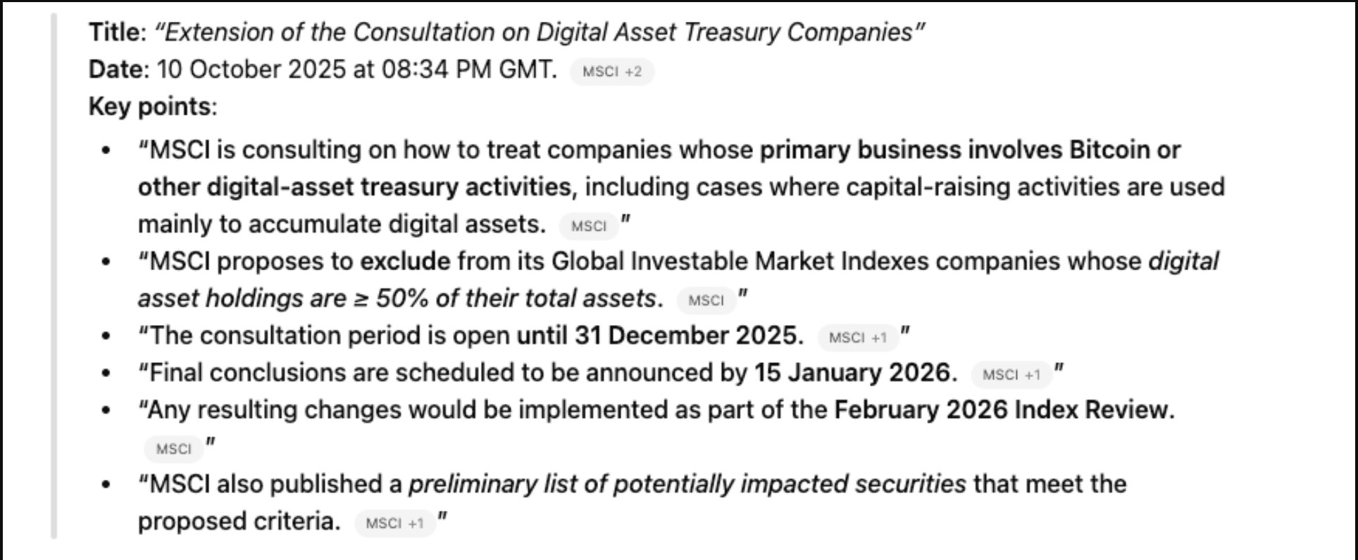 3. Esattamente il 10 ottobre, MSCI, la seconda più grande azienda di indici al mondo, ha pubblicato quanto segue. Si stanno chiedendo se le aziende che detengono criptovalute come core business debbano essere considerate "aziende" o "fondi".