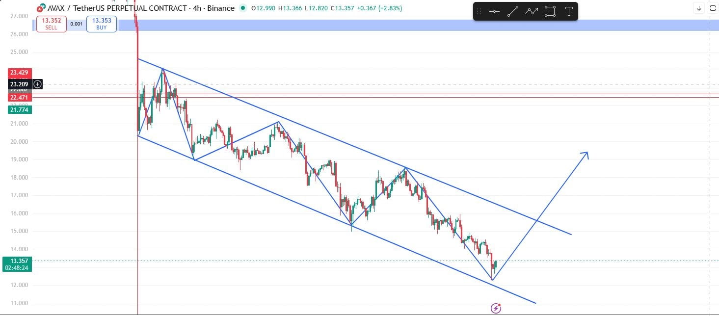 Spero tu possa vedere il grafico AVAX-hour e il prezzo attuale. Il prezzo si sta muovendo all'interno di un canale discendente ben definito, rimbalzando tra le linee di tendenza superiori e inferiori. più di 3 volte AVAX rispetta la nostra linea di supporto. spero che il prossimo obiettivo sarà $15.5, che è la nostra resistenza.