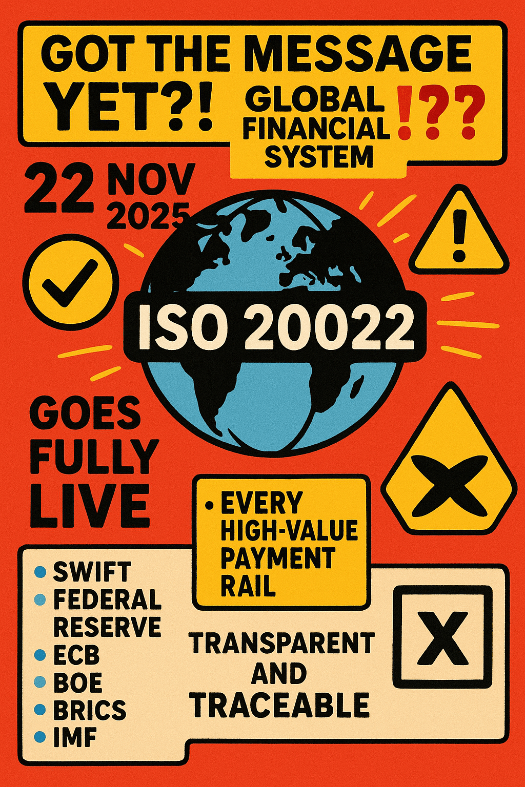 Il 22 novembre 2025, il sistema finanziario globale raggiunge un punto di non ritorno: ISO 20022 diventa completamente operativo in tutte le principali reti bancarie â@Swift SWIFT, la Federal Reserve, BCE, BOE, sistemi BRICS, il FMI, e ogni rete di pagamento ad alto valore. @XRP