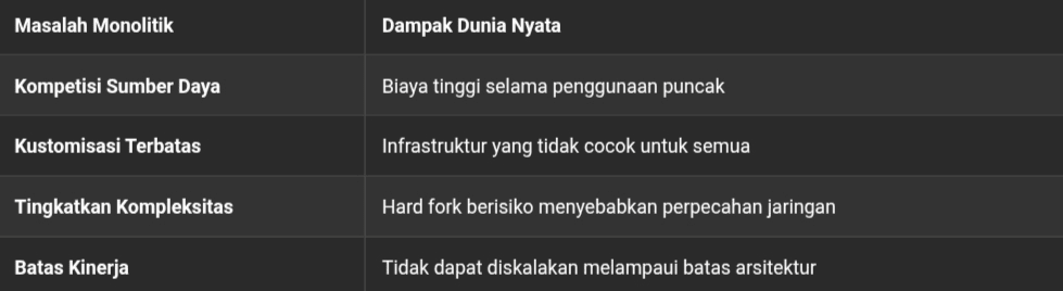 Il design monolitico aggrava questo problema. Combinando esecuzione, consenso, risoluzione e disponibilità dei dati, ogni miglioramento diventa più difficile da implementare e più rischioso da applicare. Un hard fork può dividere la comunità, e cambiamenti incrementali sono spesso limitati dal componente più debole del sistema.