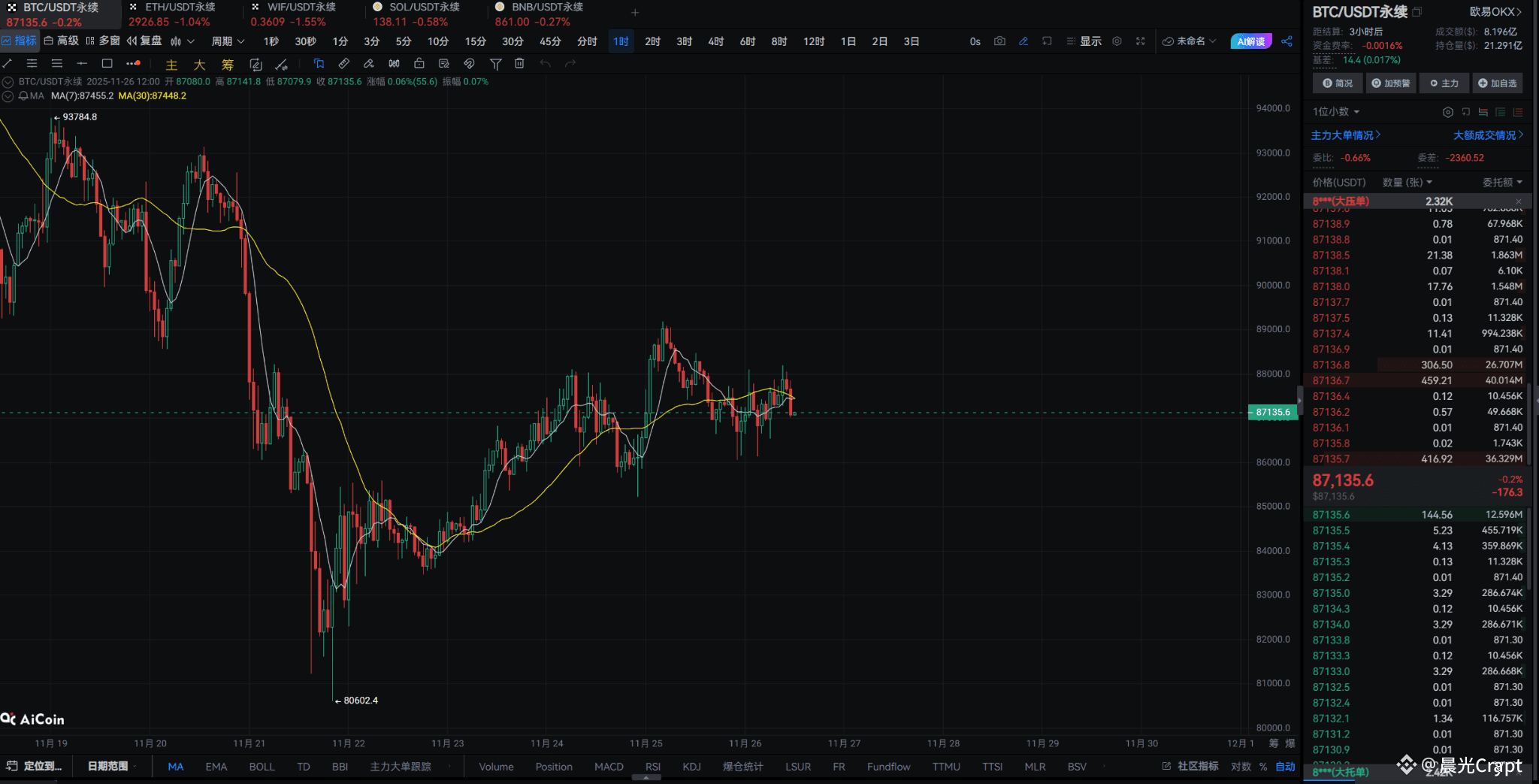 图中可以看到,前一轮深跌至 80600 美元之后,市场进入持续反弹阶段,并在 87500–89000 区间来回震荡。