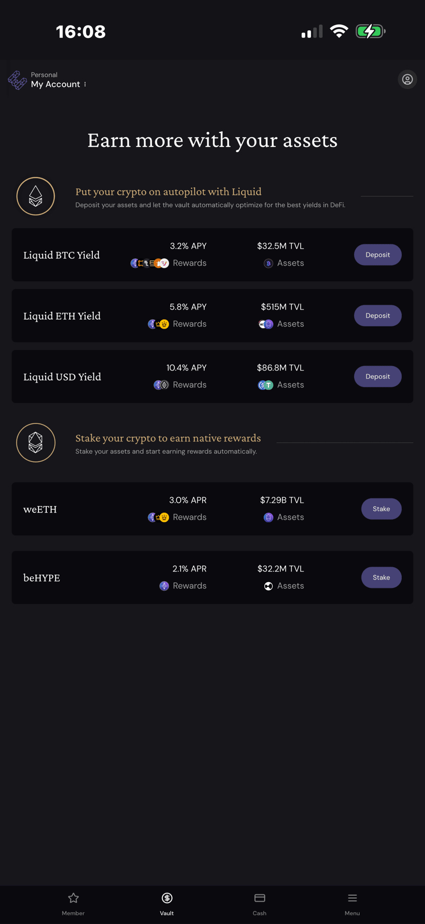 • 💎 Liquid ETH Yield: 5.8% APY. Superando il tradizionale staking (~3%), questo vault sfrutta strategie DeFi per aumentare i tuoi rendimenti. Perfetto per chi cerca di accumulare più ETH.